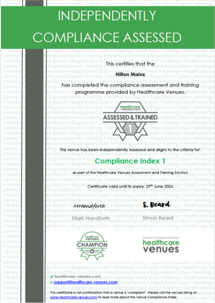 Hilton Mainz has established experience in hosting healthcare and pharmaceutical meetings, supported by dedicated healthcare specialists within its global meetings and events and sales teams. The venue has hosted healthcare-related events including laboratory-focused meetings, medical technology events, ultrasound training courses and pharmaceutical conferences. The hotel holds master service agreements with several major healthcare organisations, including AbbVie, Eli Lilly, Novo Nordisk, Pfizer and Abbott. The venue’s experience includes managing regulated meetings and adapting operational processes to meet healthcare compliance requirements.