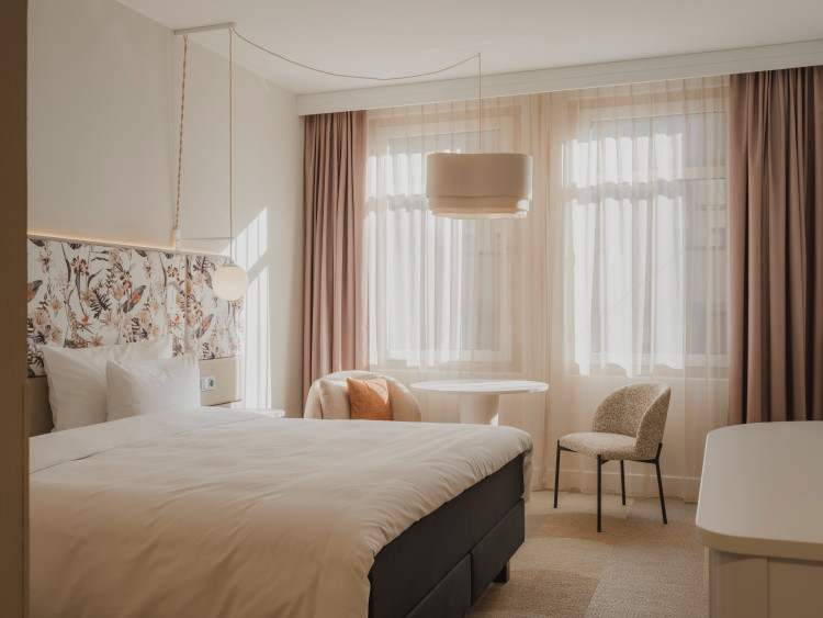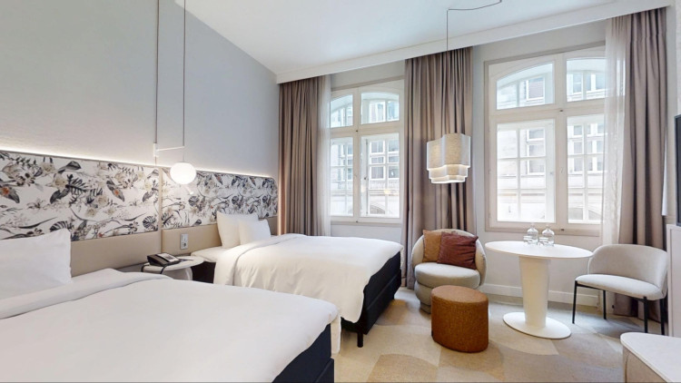 The hotel’s exterior design combines sand-coloured stone with historic architecture, as the back of the building is part of Böttcherstraße. Internally, the hotel features a modern contemporary design with historic elements, ensuring a professional and welcoming environment. The layout provides privacy in public areas and easy, discrete access to meeting spaces.