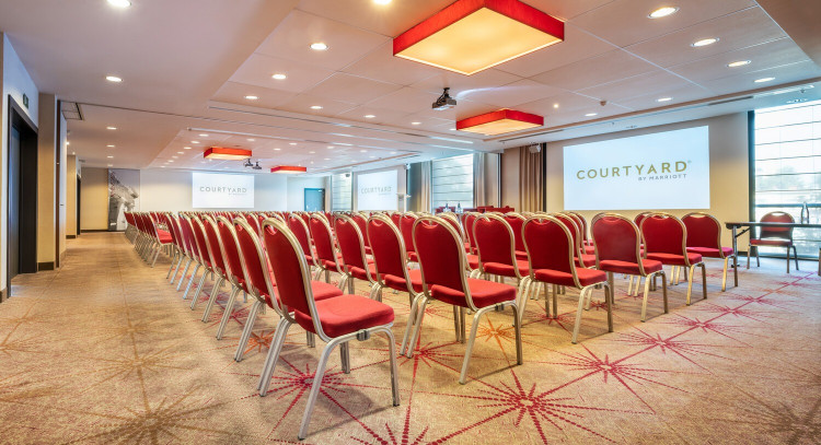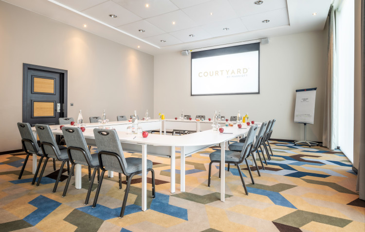 Courtyard by Marriott Brussels offers 11 meeting rooms distributed across two floors. The principal meeting level comprises nine rooms and a dedicated foyer area suitable for networking and receptions. The Athens Ballroom, the largest room, holds 250 delegates in theatre style and is accompanied on the same level by the Antwerp Room (100 theatre), Sydney, Barcelona, Atlanta, and Seoul Rooms (each 50 theatre), and Amsterdam and Stockholm Rooms (10 boardroom). The spaces are flexible and can be configured for training, seminars, or corporate events. The entire first floor can be made exclusive for confidential meetings, providing a private environment for compliant healthcare or corporate functions.