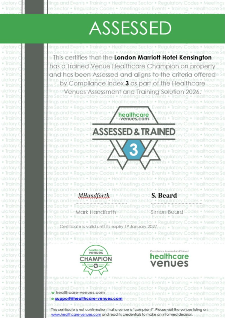 Located in West London’s established medical and academic district, London Marriott Hotel Kensington provides an exceptionally well‑connected base for pharmaceutical meetings and healthcare‑focused events. The hotel is within walking distance of Imperial College London and close to leading research institutions including Royal Marsden Hospital, The institute of Cancer Research and Royal Brompton Hospital. With proximity to Olympia London and direct Piccadilly line access from Earl's court to Heathrow Airport, the hotel offers convenient connectivity for both UK and international delegates.