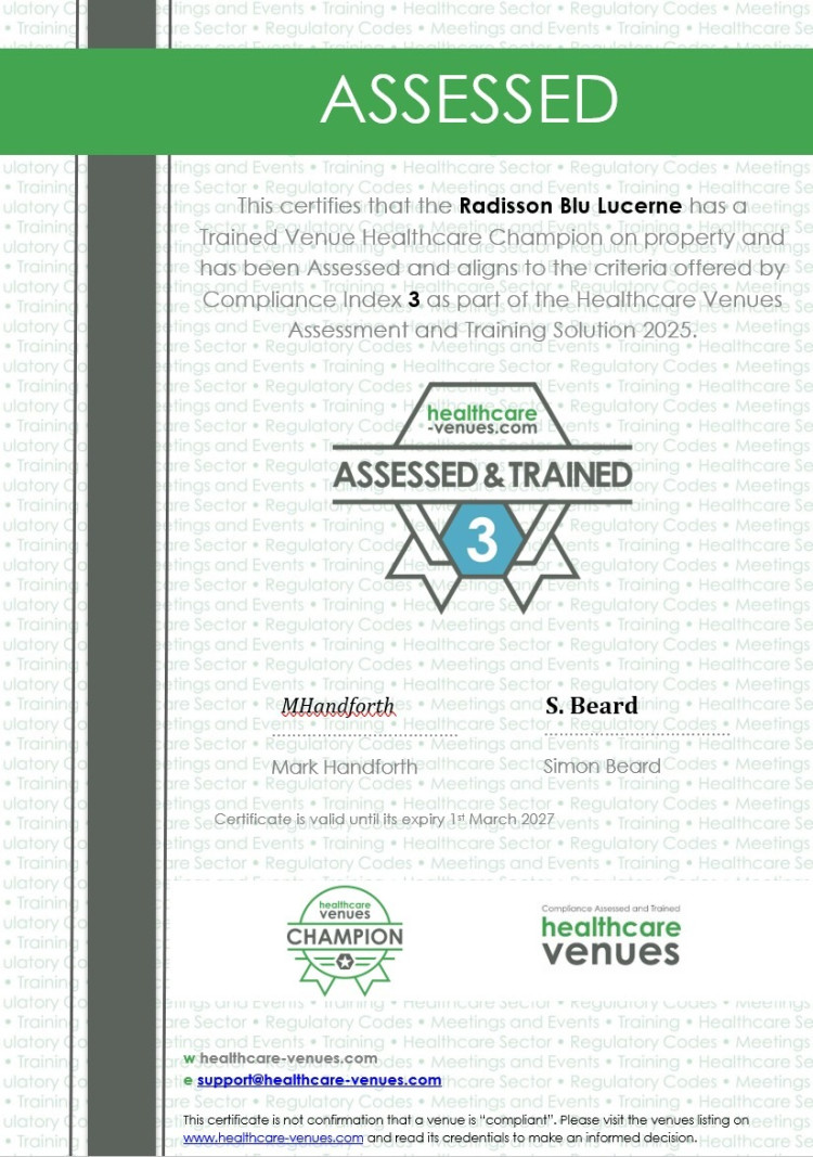 The hotel has experience hosting healthcare and life sciences meetings, including training sessions and educational meetings. The conference facilities support small board meetings through to larger plenary sessions of up to 220 delegates in a single theatre-style room, with total event capacity reaching approximately 600 across combined spaces. The hotel operates in accordance with Radisson Hotel Group standards, including established agreements with healthcare agencies as applicable at corporate level. No formal partnerships with local science parks or healthcare clusters were specified, although multinational healthcare company headquarters are located within the wider region.